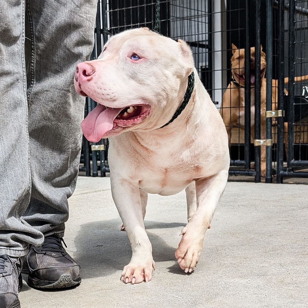 Meet Ice, our exceptional 1-year-old female XL Bully with an exquisite icy white coat that gleams with elegance. Her striking appearance is complemented by a strong, athletic build, embodying both beauty and power.