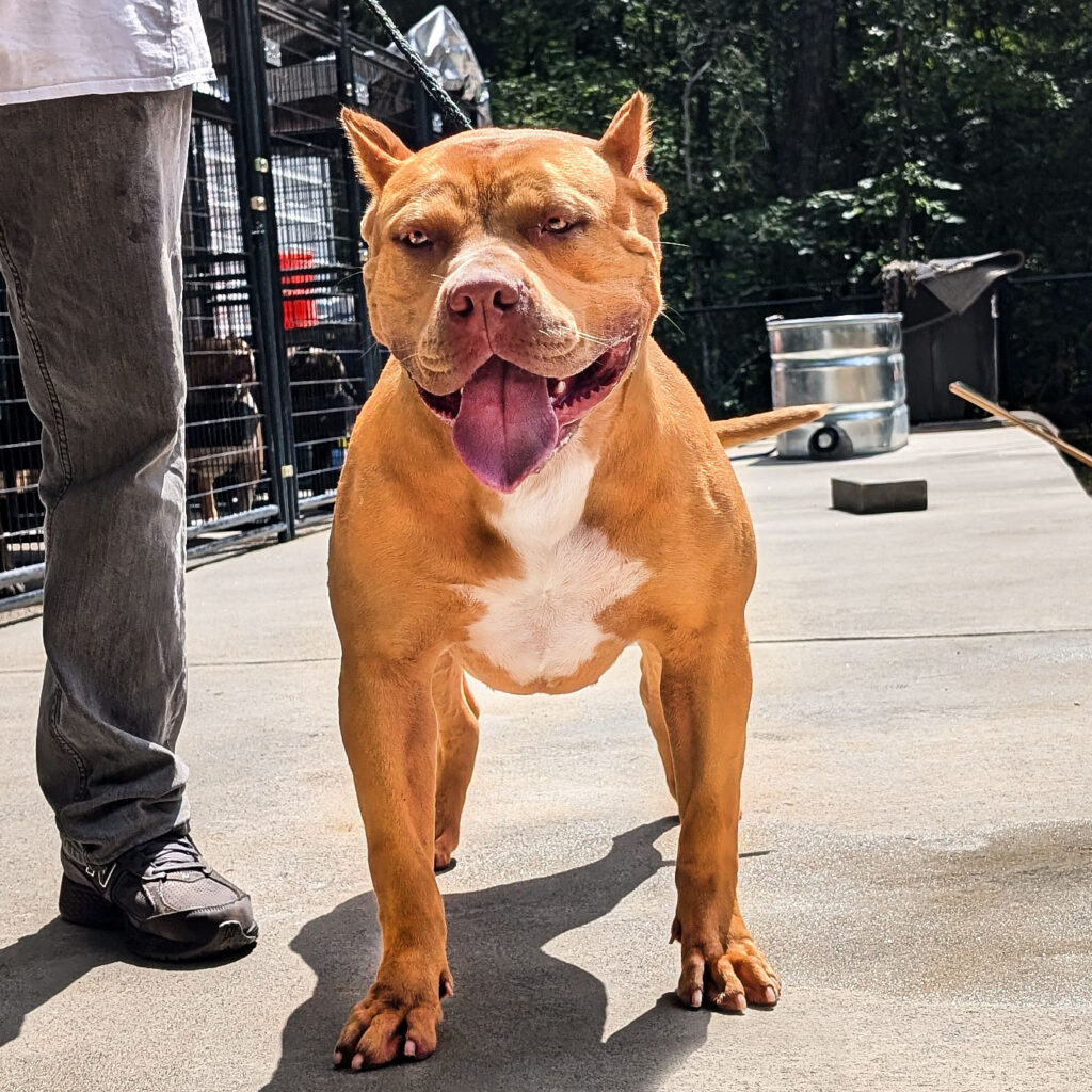 Her vibrant red coat is just the beginning; Nyla’s personality is equally impressive. She’s known for her affectionate nature and playful spirit, always eager to engage with her family and make new friends. Despite her impressive size and powerful physique, Nyla has a gentle and loving demeanor, making her an ideal companion for both active play and quiet cuddles.
