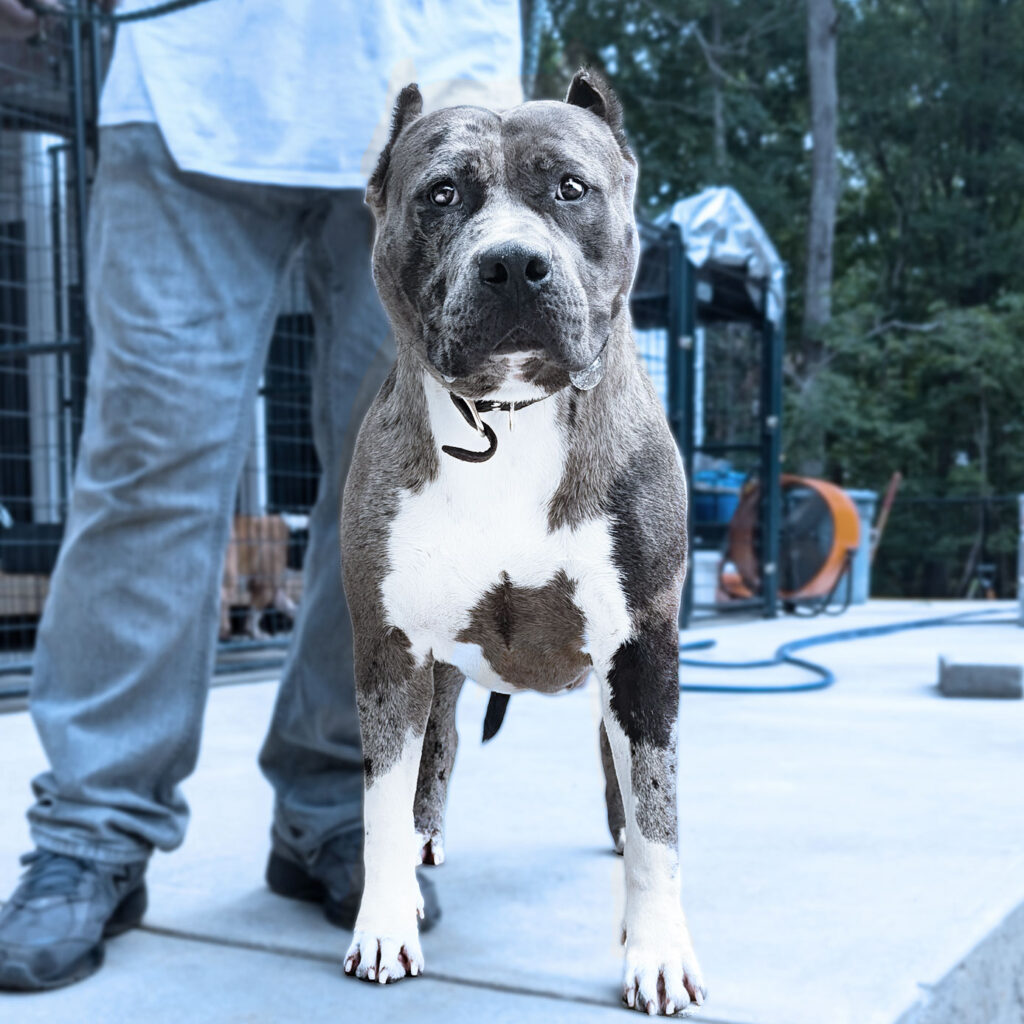 Meet Shadow, our stunning 1-year-old female XL Bully, known for her captivating blue blotched coat. Her unique markings and sleek, muscular build make her a standout at Fearless XL Bully Kennels.